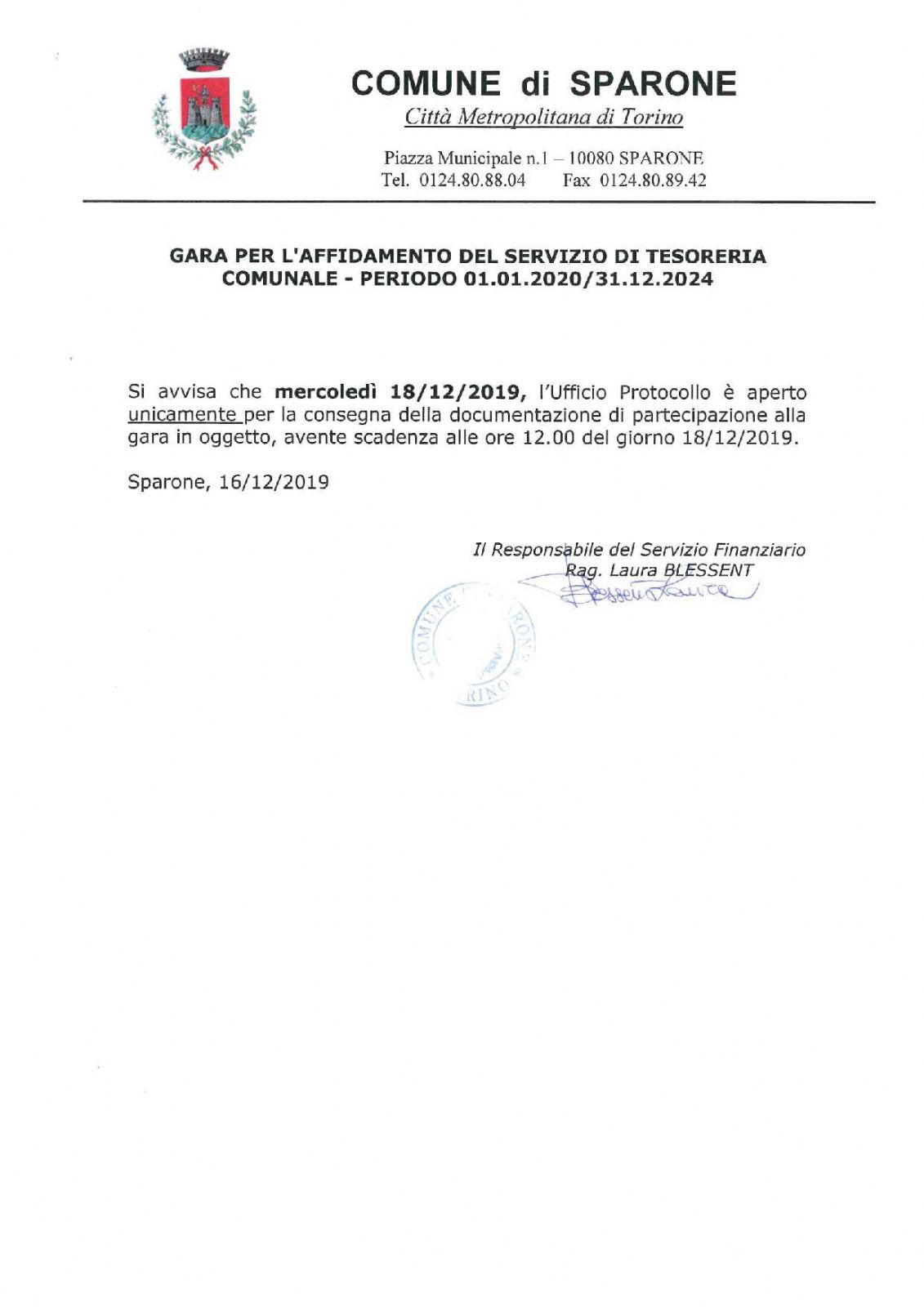 SI AVVISA CHE MERCOLEDI' 18.12.2019 L'UFFICIO PROTOCOLLO E' APERTO UNICAMENTE PER LA CONSEGNA DELLA DOCUMENTAZIONE DI PARTECIPAZIONE ALLA GARA PER L'AFFIDAMENTO DEL SERVIZIO DI TESORERIA COMUNALE - PERIODO 01.01.2020 - 31.12.2024, AVENTE SCADENZA ALLE ORE 12.00 DEL 18.12.2019