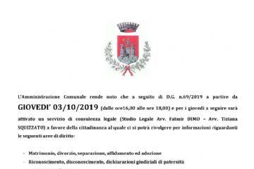 ATTIVAZIONE SPORTELLO PER SERVIZIO CONSULENZA LEGALE - DAL 03 OTTOBRE 2019