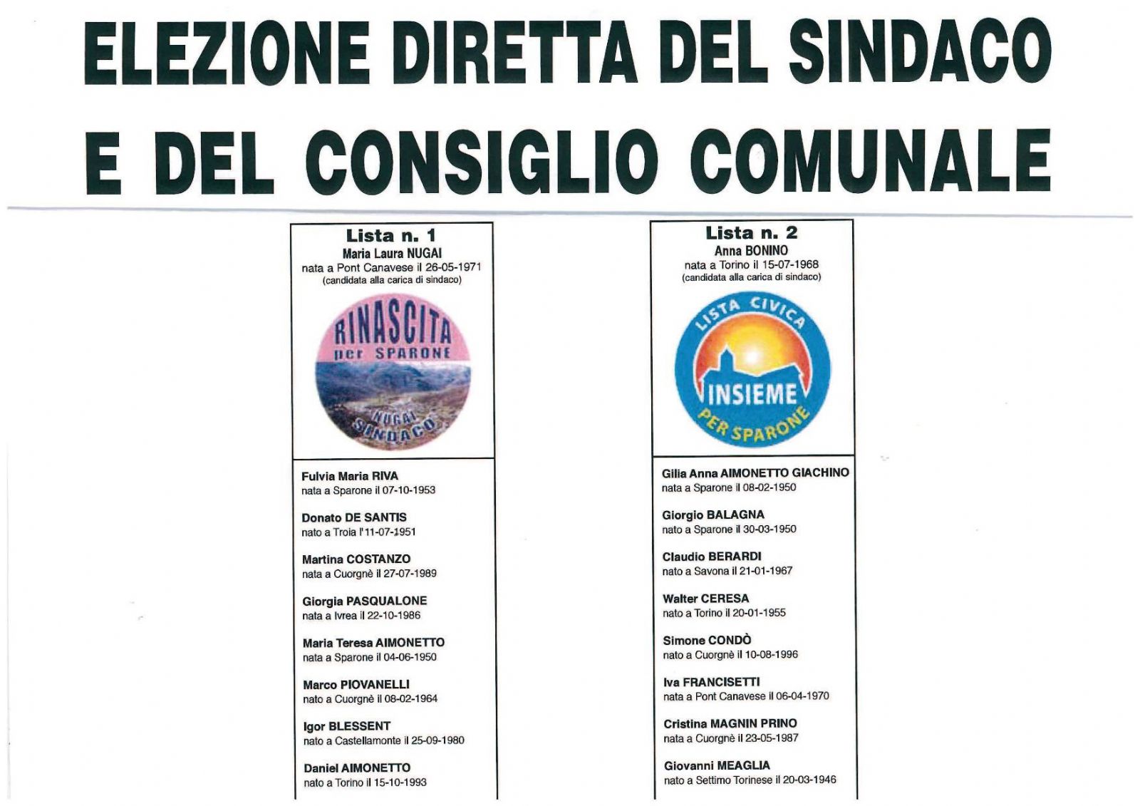 ELEZIONE DIRETTA DEL SINDACO E DEL CONSIGLIO COMUNALE - Liste dei candidati per l'elezione diretta alla carica di Sindaco e n.10 Consiglieri Comunali che avrà luogo DOMENICA 26 MAGGIO 2019