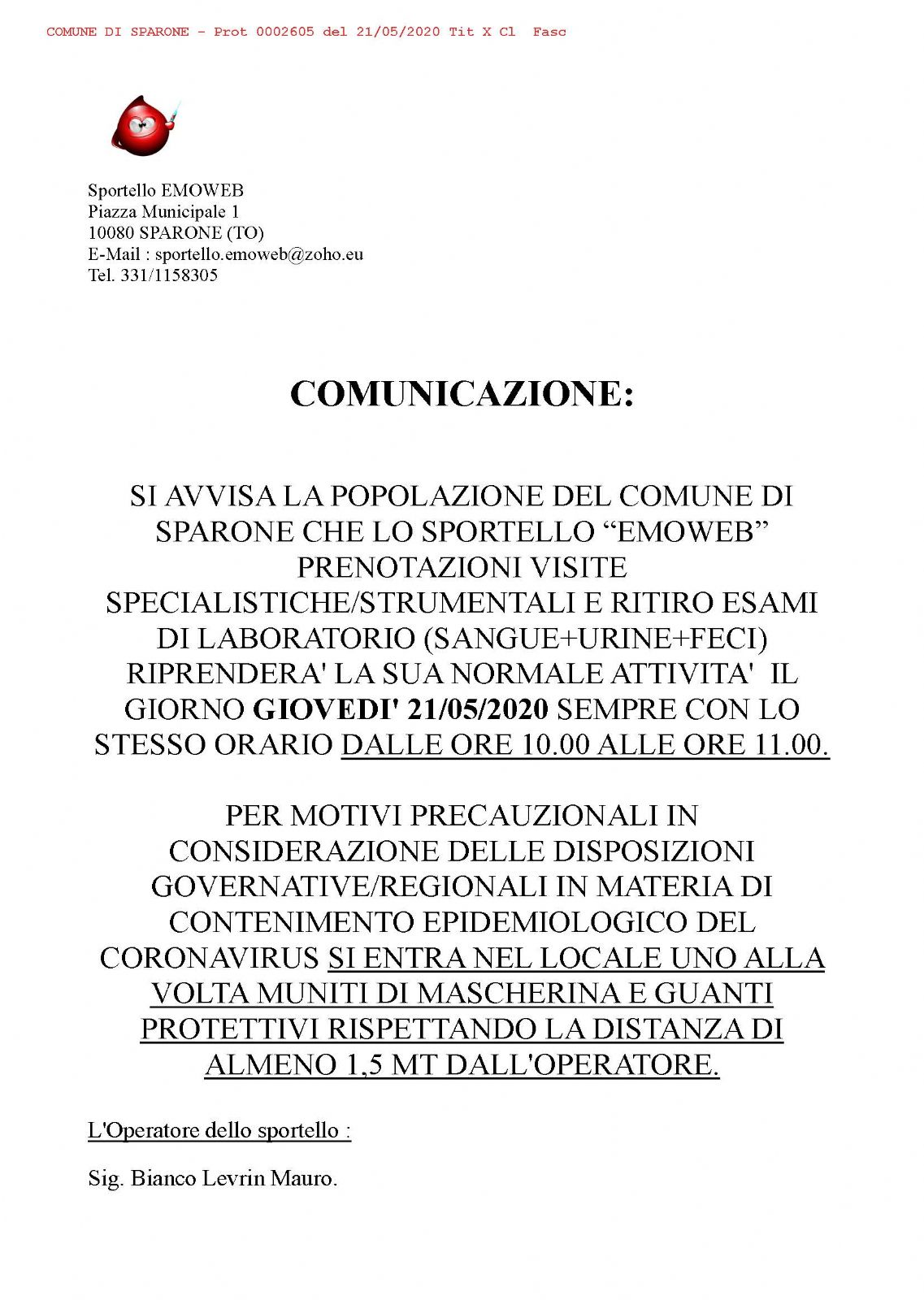 LO SPORTELLO EMOWEB RIPRENDERA' LA SUA NORMALE ATTIVITA' IL GIORNO 21.05.2020 DALLE ORE 10.00 ALLE ORE 11.00