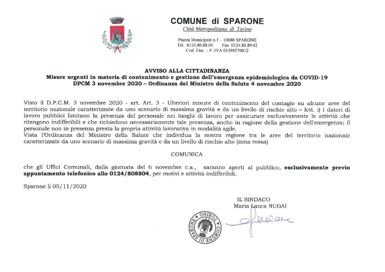 Si comunica che gli Uffici Comunali saranno aperti al pubblico solo esclusivamente previo APPUNTAMENTO telefonico allo 0124/808804 per motivi e attività indifferibili