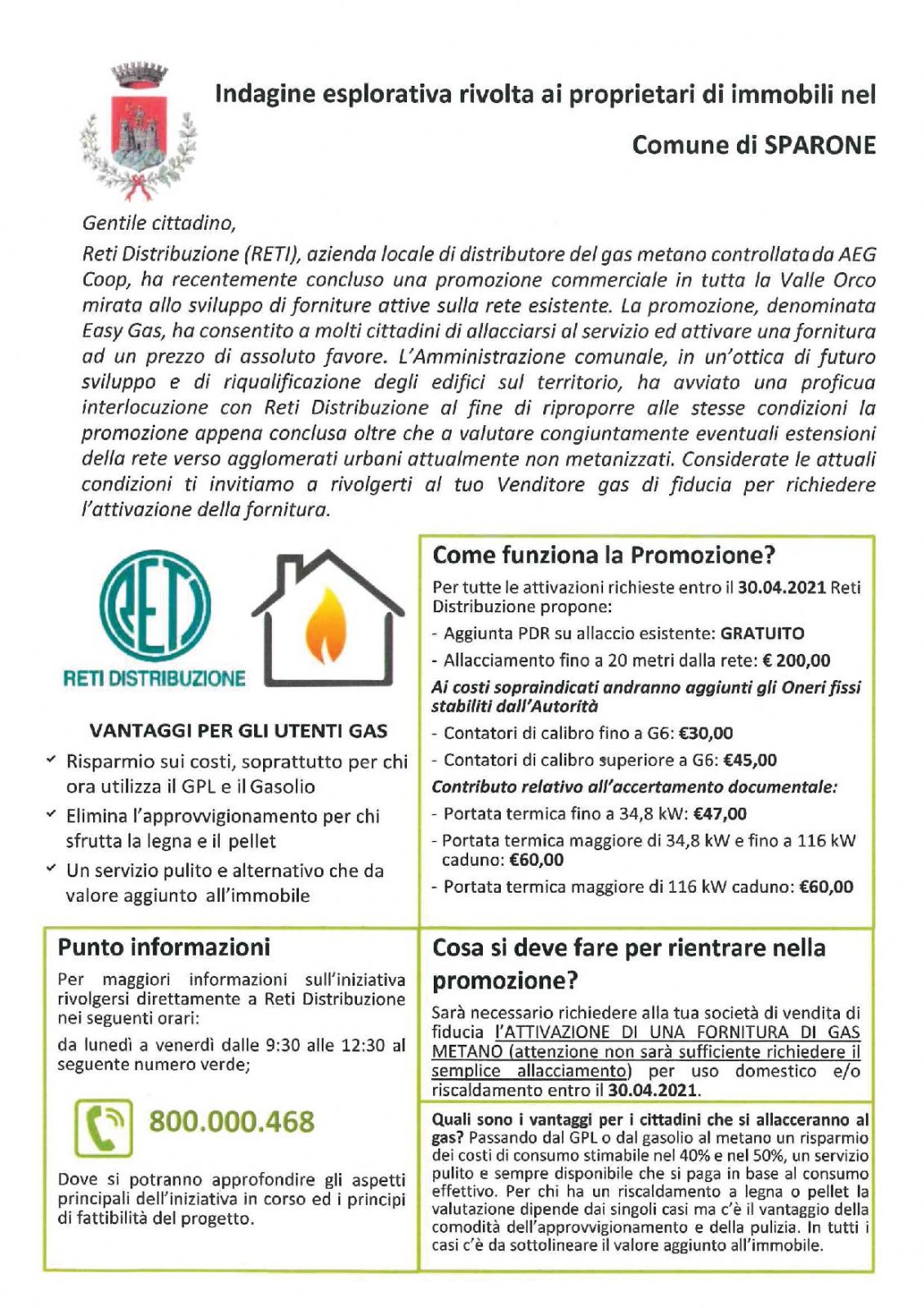 L’Amministrazione comunale, in un’ottica di futuro sviluppo e di riqualificazione degli edifici sul territorio, ha avviato una proficua interlocuzione con Reti Distribuzione al fine di riproporre alle stesse condizioni la promozione appena conclusa oltre che a valutare congiuntamente eventuali estensioni della rete verso agglomerati urbani attualmente non metanizzati.