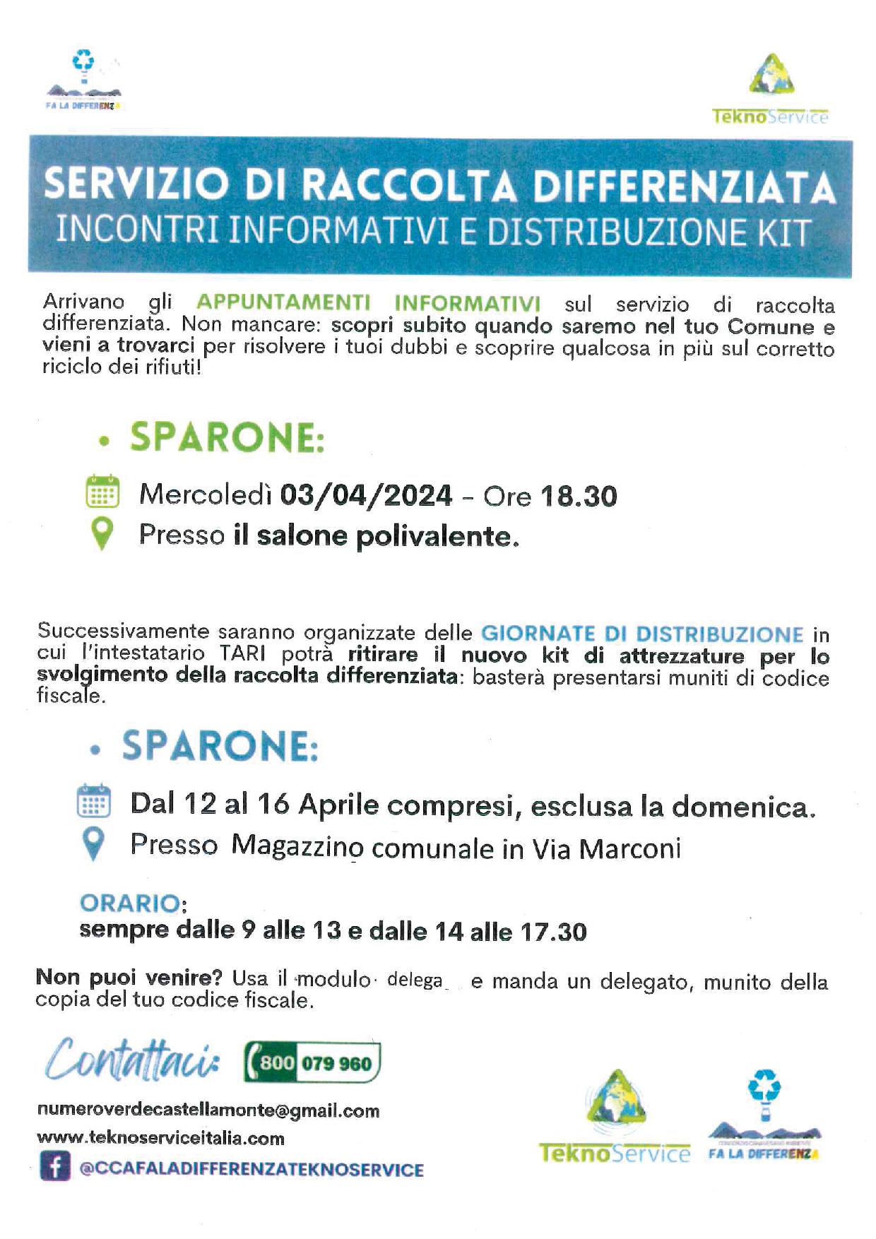 Vi aspettiamo mercoledì 03 aprile 2024 alle ore 18.30 presso il Salone Polivalente del Comune di Sparone per un incontro informativo sul nuovo servizio di raccolta differenziata.