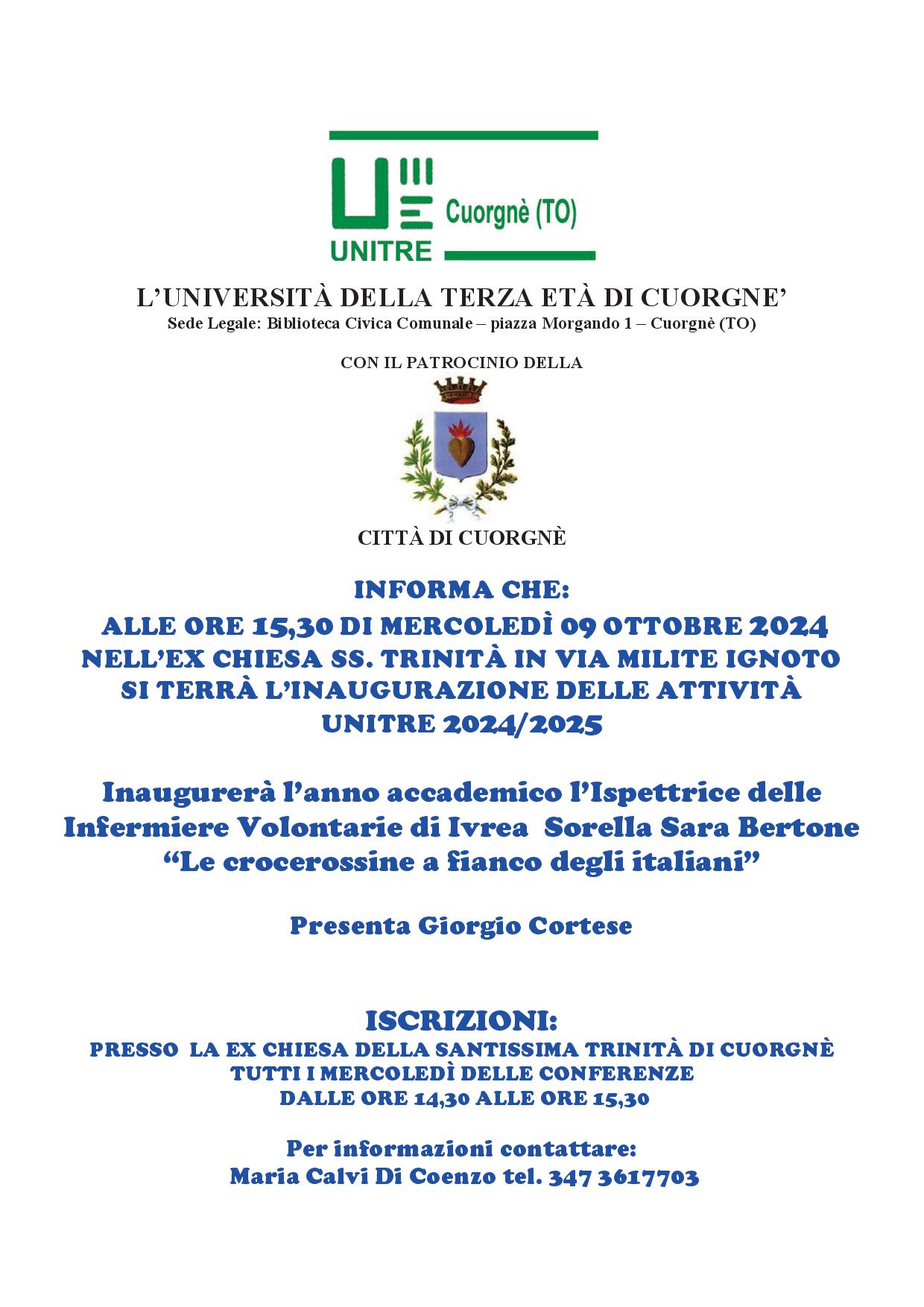 che alle ore 15.30 di mercoledì 09 OTTOBRE 2024 nell'ex chiesa S.S. Trinità di Cuorgnè in Via Milite Ignoto si terrà l'inaugurazione delle attività di UNITRE 2024/2025.