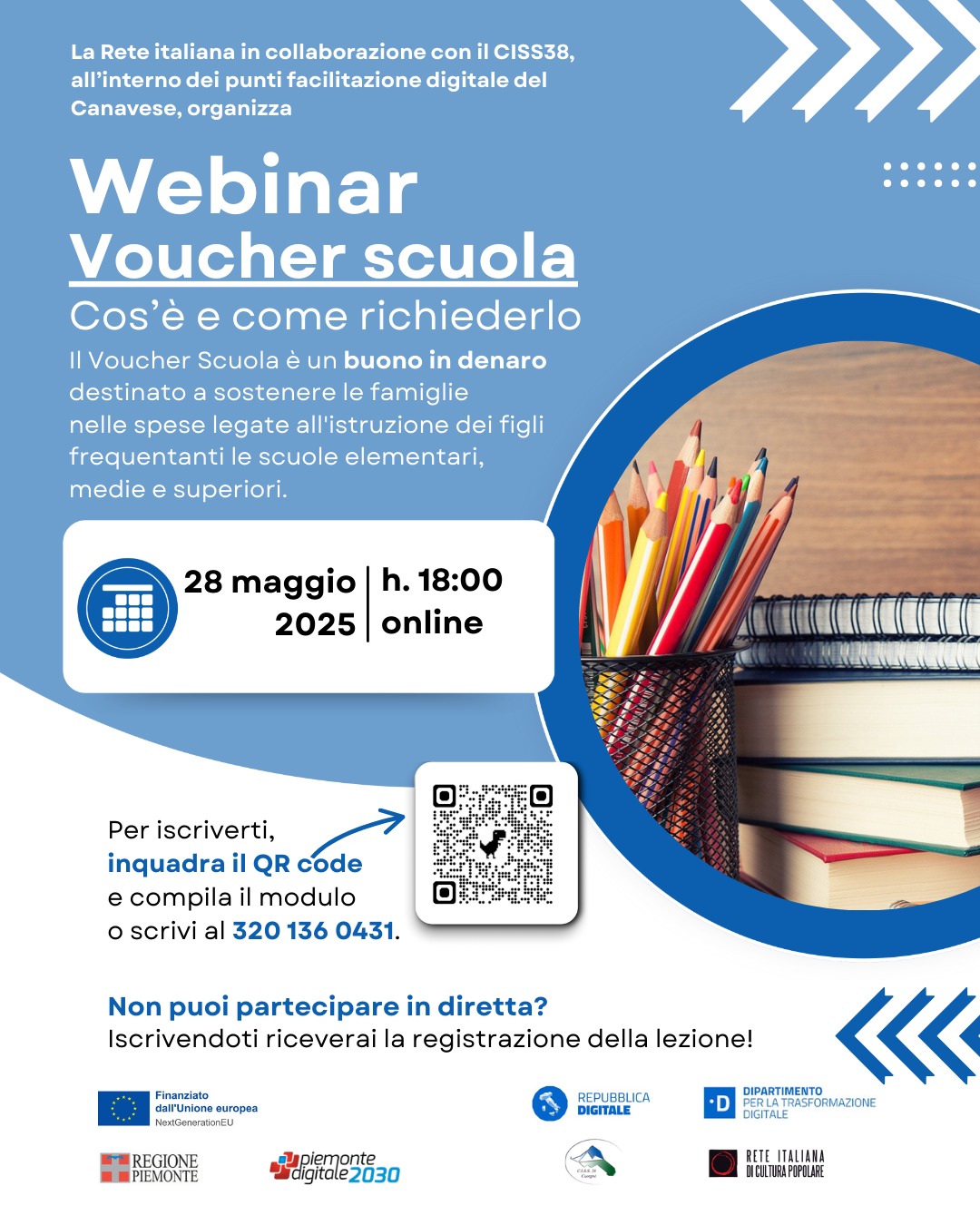 La Rete italiana, nell’ambito dei Punti di Facilitazione Digitale del Canavese, organizza un webinar gratuito per fornire informazioni pratiche e aggiornate sul Voucher Scuola della Regione Piemonte, un contributo economico destinato a sostenere le spese scolastiche per bambini e ragazzi delle scuole elementari, medie e superiori.