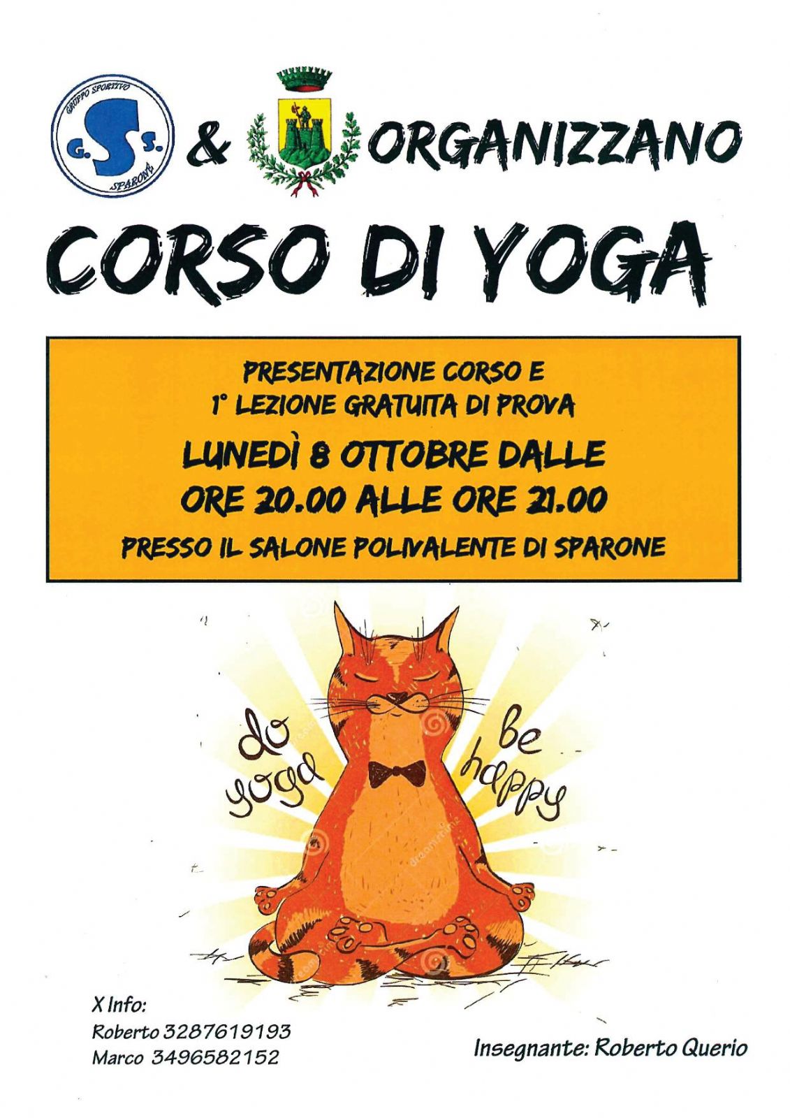 CORSO DI YOGA - PRESENTAZIONE CORSO - 1°LEZIONE GRATUITA DI PROVA - LUNEDI' 8 OTTOBRE DALLE ORE 20.00 ALLE ORE 21.00 - PRESSO IL SALONE POLIVALENTE DI SPARONE