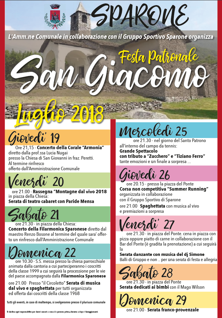 L'Amministrazione Comunale in collaborazione con il Gruppo Sportivo Sparone organizza la Festa Patronale San Giacomo