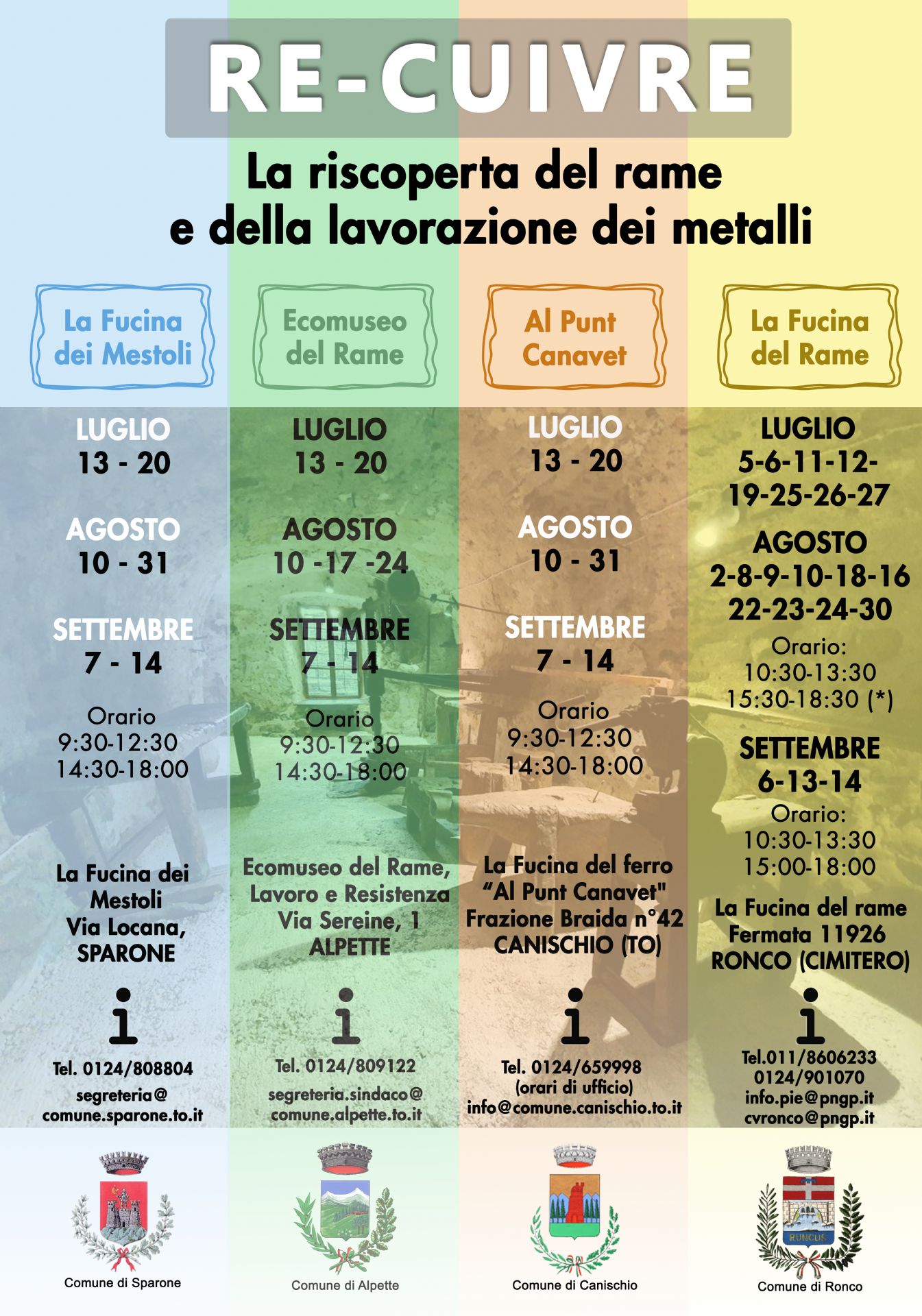 Luglio 13-20 Agosto 10-31 Settembre 7-14 Orario 9:30-12:30 14:30-18:00