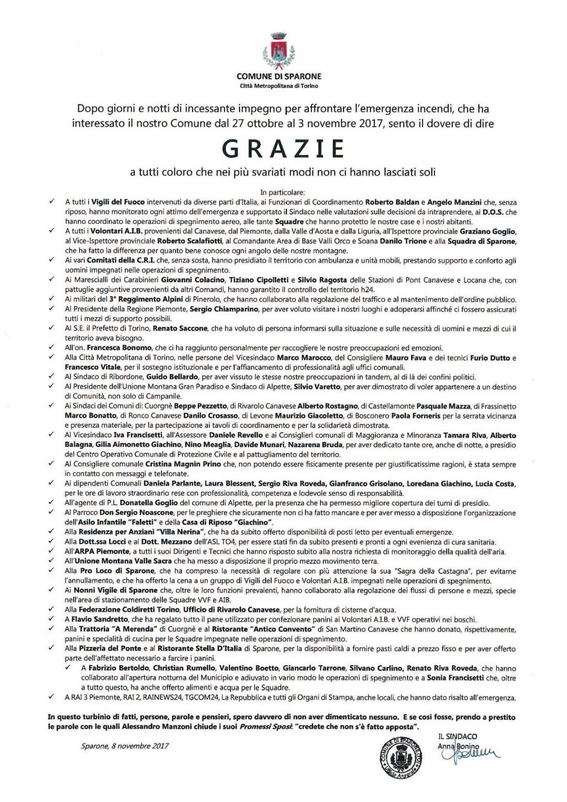 Dopo giorni e notti di incessante impegno per affrontare l'emergenza incendi, che ha interessato il nostro Comune dal 27 ottobre al 3 novembre 2017, sento il dovere di dire GRAZIE a tutti coloro che nei più svariati modi non ci hanno lasciati soli.