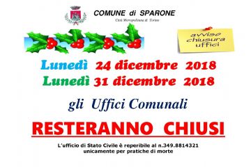 Lunedì 24 e Lunedì 31 dicembre 2018 gli uffici resteranno chiusi.