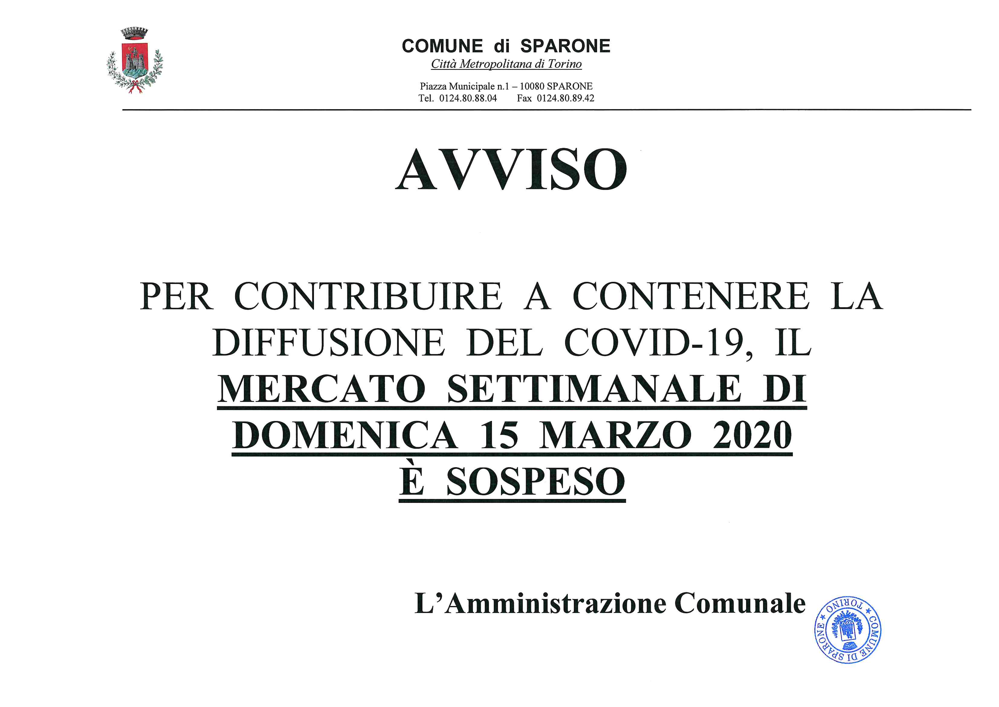 Sospensione mercato settimanale di domenica 15 marzo 2020