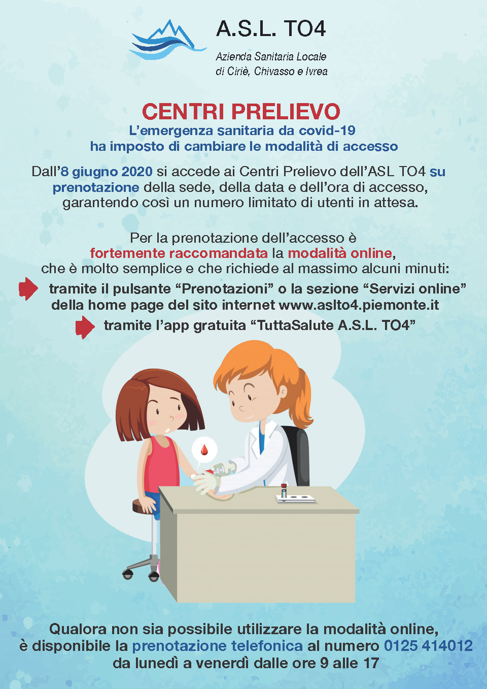 dall' 8 giugno 2020 si accede ai Centri Prelievo dell'ASL TO4 su PRENOTAZIONE della sede, della data e dell'ora di accesso, garantendo così un numero limitato di utenti in attesa.