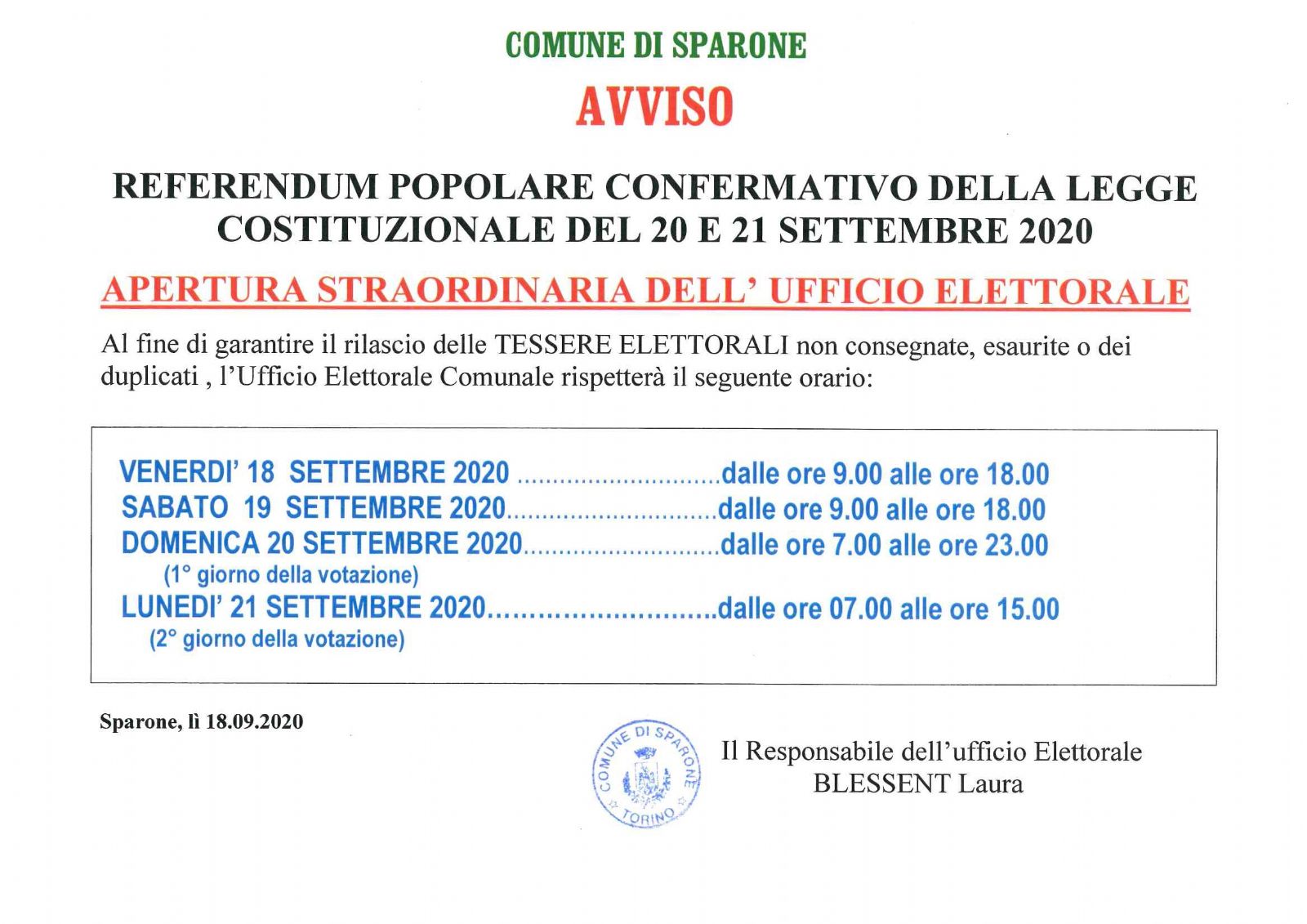 Al fine di garantire il rilascio delle Tessere Elettorali non consegnate. esaurite e dei duplicati, l'Ufficio Elettorale Comunale sarà aperto da venerdì a lunedi'