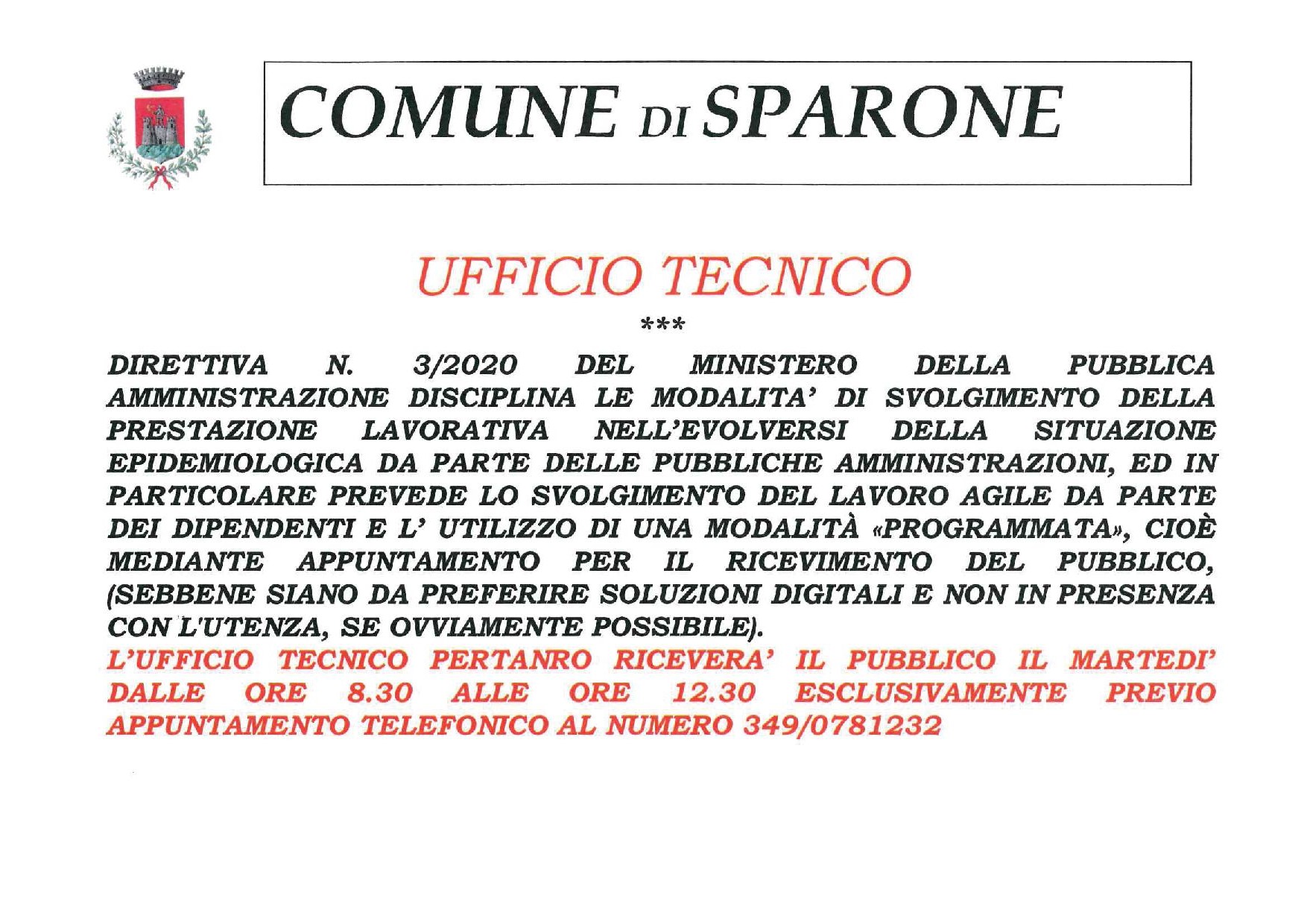 L'UFFICIO TECNICO RICEVE IL PUBBLICO IL MARTEDI' DALLE ORE 08.30 ALLE ORE 12.30 ESCLUSIVAMENTE PREVIO APPUNTAMENTO TELEFONICO AL NUMERO 349/0781232