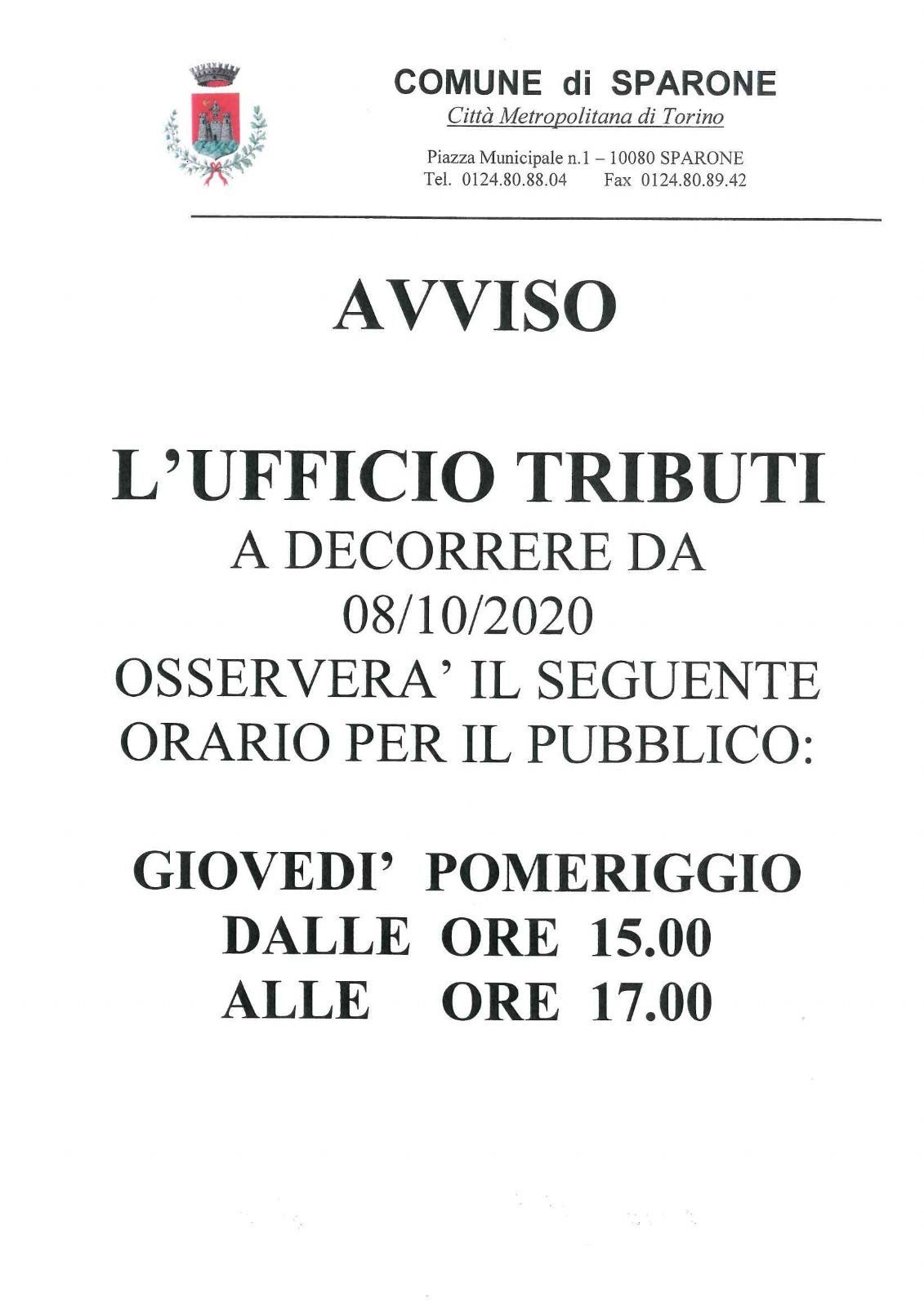 L'ufficio Tributi a decorrere da 08/10/2020 osserverà il seguente orario per il pubblico:
