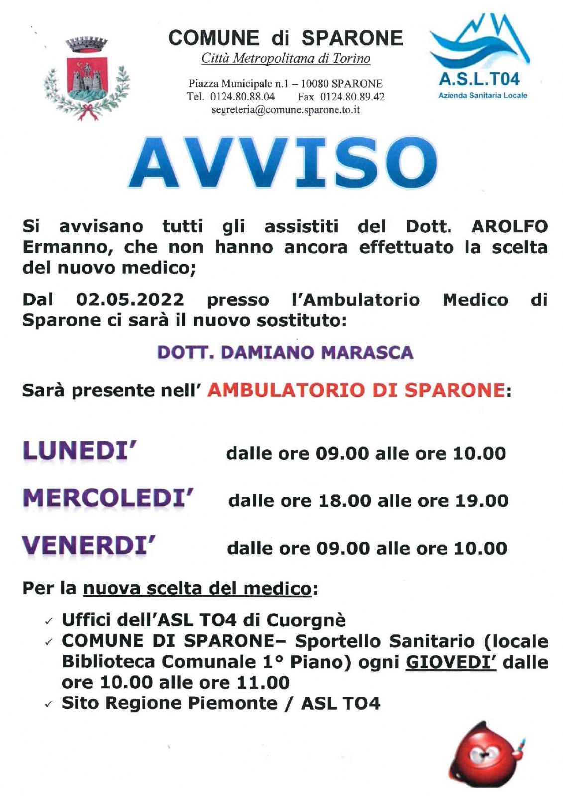 Si avvisano tutti gli assistiti del Dott. AROLFO Ermanno, che non hanno ancora effettuato la scelta del nuovo medico; dal 02.05.2022 presso l’Ambulatorio Medico di Sparone ci sarà il nuovo sostituto: