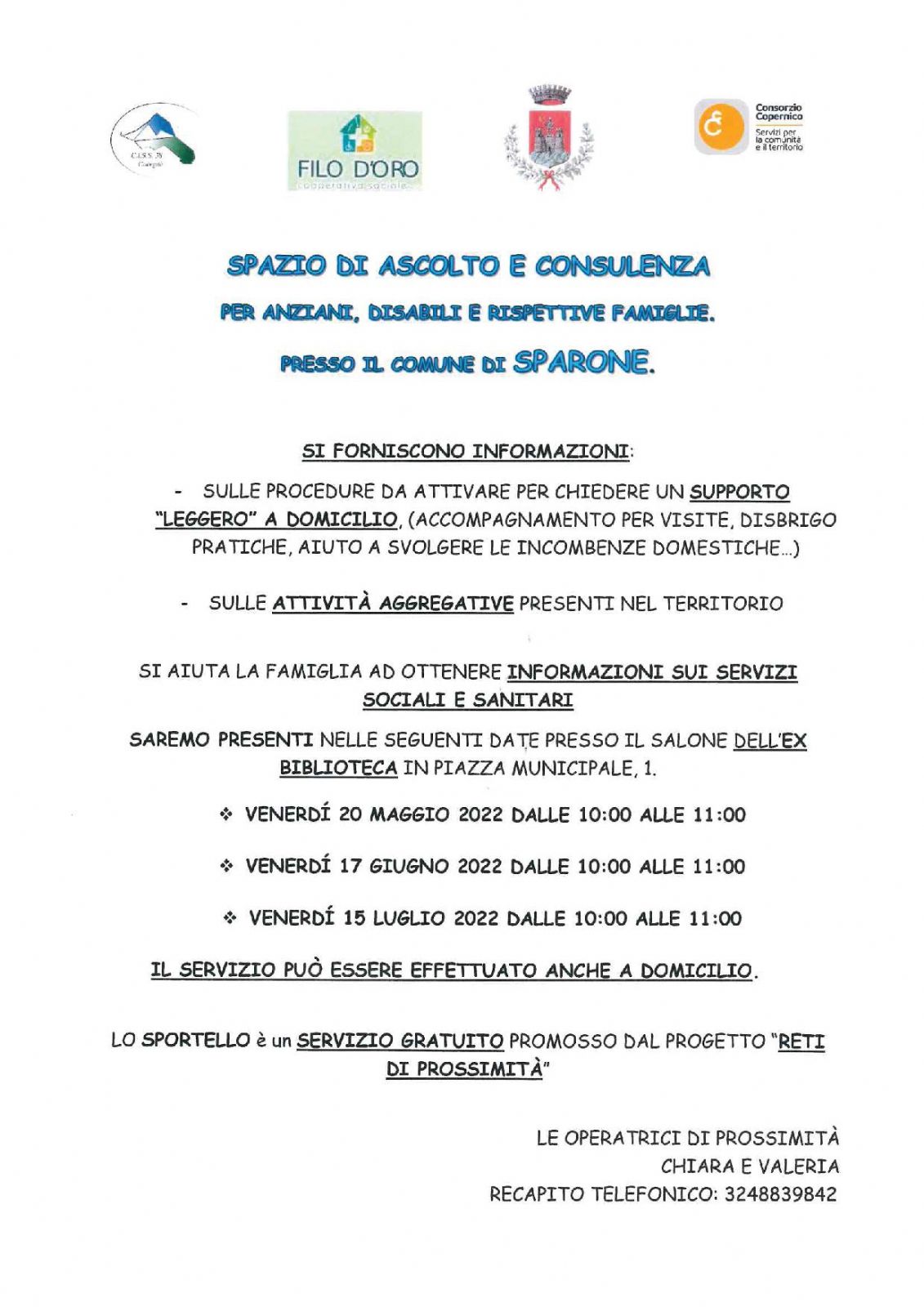 LO SPORTELLO è un SERVIZIO GRATUITO PROMOSSO DAL PROGETTO “RETI DI PROSSIMITÀ”