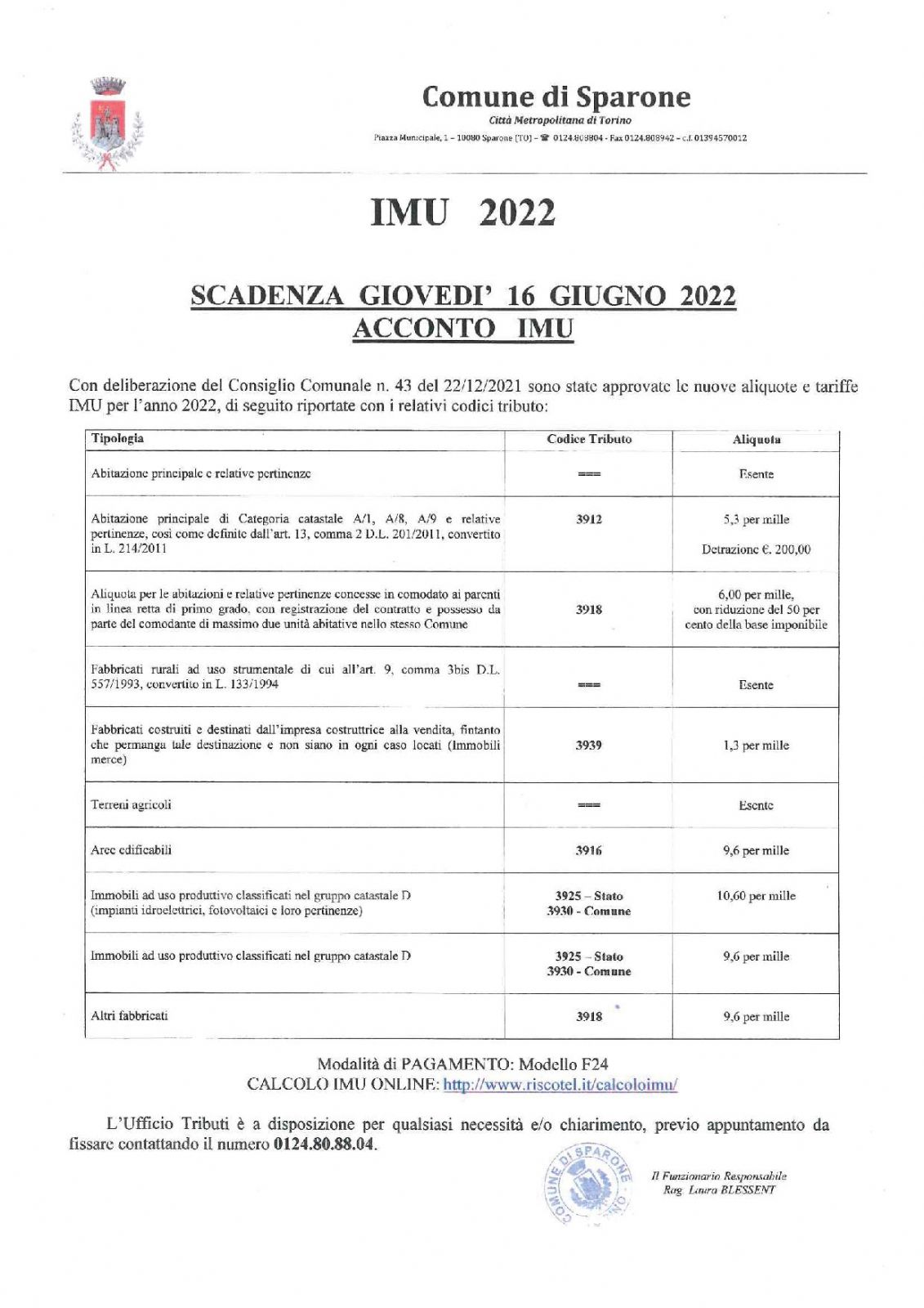 ACCONTO IMU - SCADENZA GIOVEDI' 16 GIUGNO 2022
