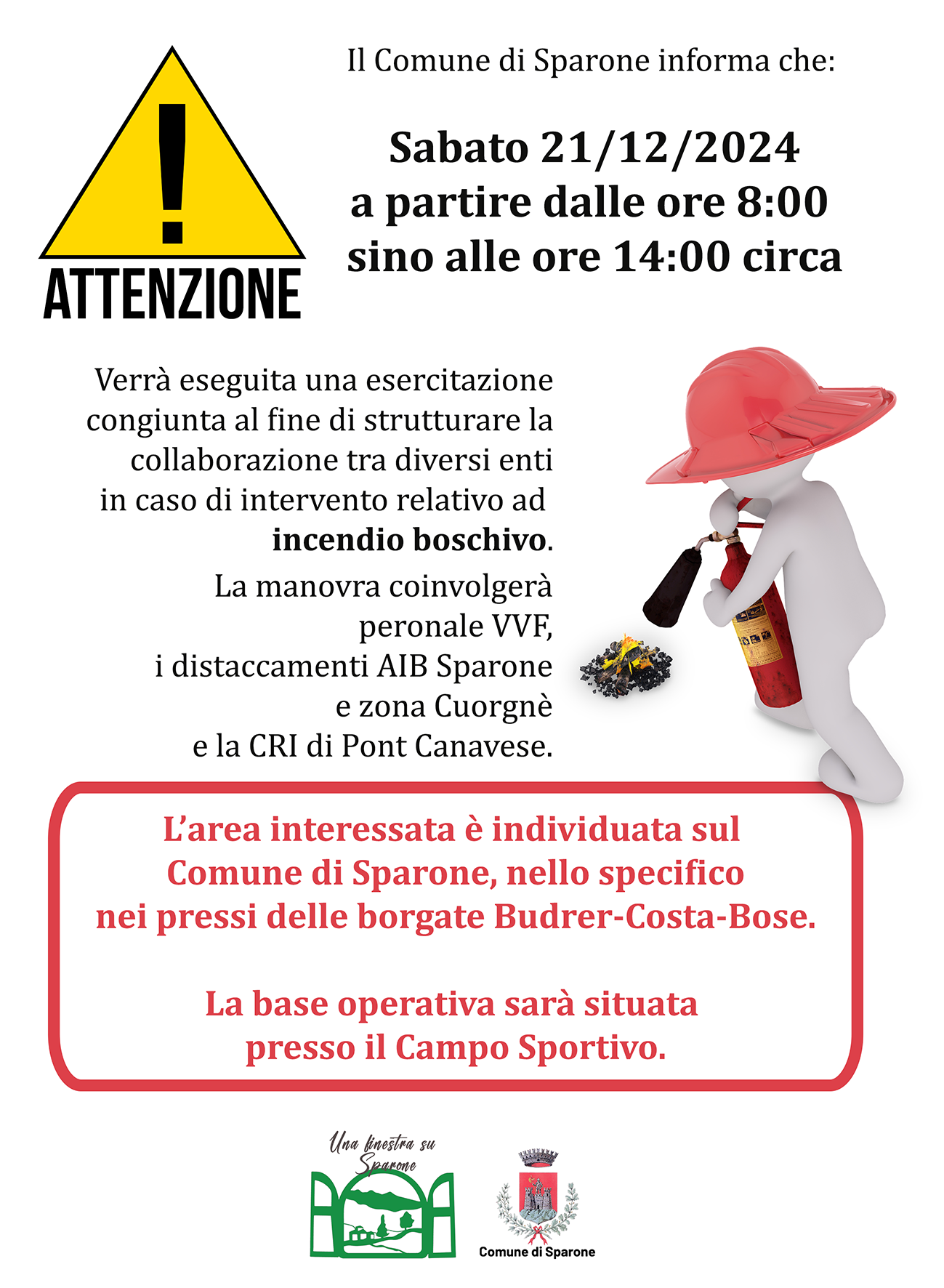 Il Comune di Sparone informa che il 21 dicembre 2024 a partire dalle ore 08.00 sino alle ore 14.00 circa verrà eseguita una esercitazione congiunta al fine di strutturare la collaborazione tra diversi enti in caso di intervento relativo ad incendio boschivo.