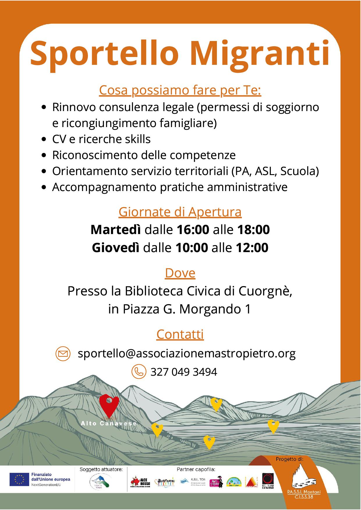 Sportello Migranti con sede presso la Biblioteca Civica di Cuorgnè che sarà attivo nei giorni: