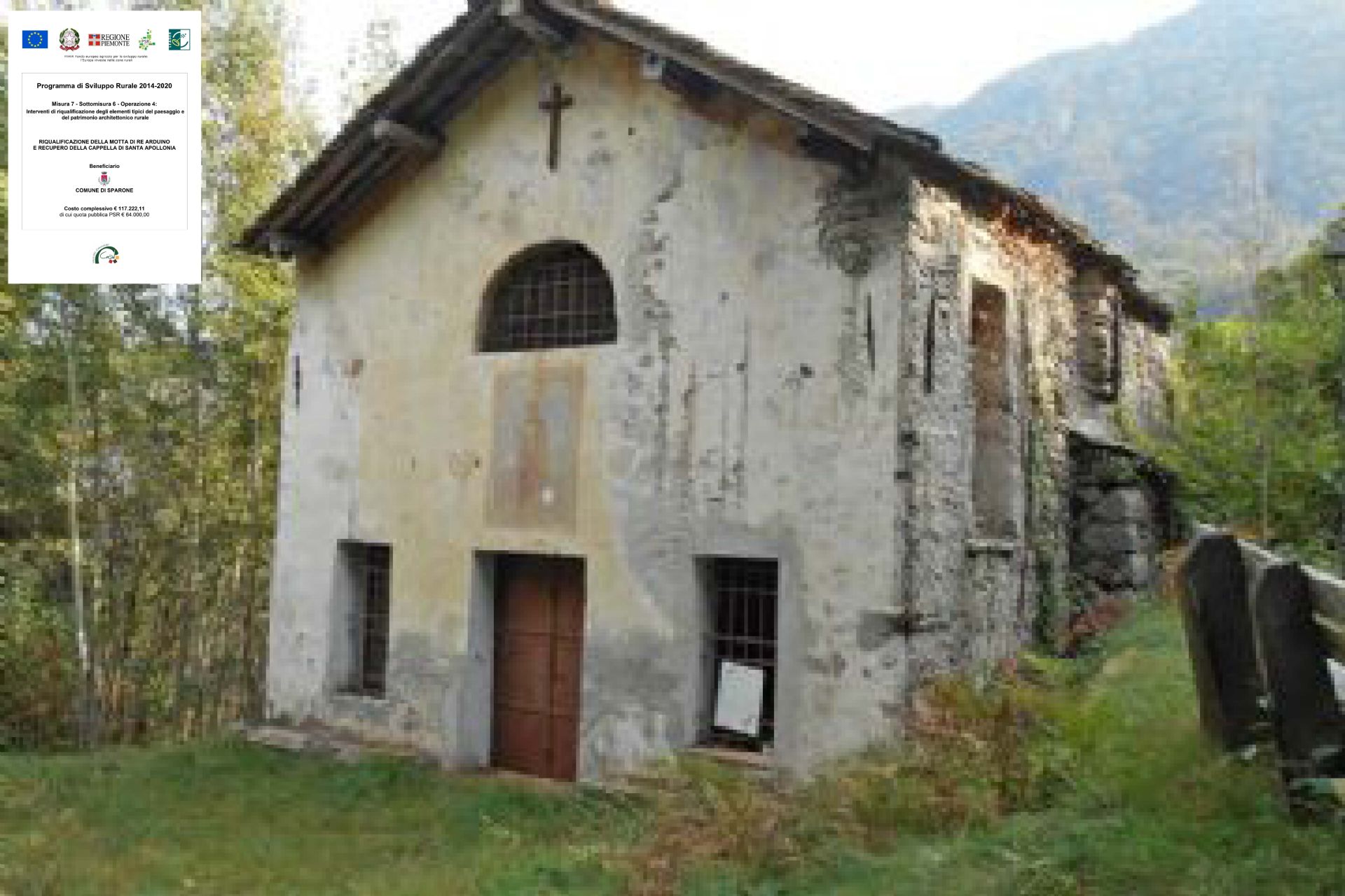 Posta lungo la strada che porta alla rocca è citata già nel 1582, anno della visita di Mons. Ferreri, come chiesa della SS. Trinità. L'attuale edificio risale al 1673, riedificato dagli sparonesi, come attesta la scritta nella cappella: "SUMPTIBUS 1673 SPARONI - B.C. F.F.", a seguito dell'interdizione di utilizzo dell'edificio da parte di Mons. Milliet nel 1660. Nel 1808 è ancora citata come "Cappella della SS. Trinità"; invece nel 1826 Mons. Luigi Pochettini la annota già come "Cappella di Santa Apollonia". La chiesa, il cui interno è completamente spoglio, versava in totale stato di abbandono; è stata recuperata in parte dai giovani dell'Oratorio Parrocchiale nel 1993. Vi era un bellissimo altare ligneo con diverse statue di santi poste su colonne dorate, restaurato ed indorato nel 1888; fu completamente trafugato da ignoti negli anni '60. Sulla facciata vi è un affresco del 1906, assai degradato, del pittore Silvestro da Montanaro, raffigurante Santa Apollonia.