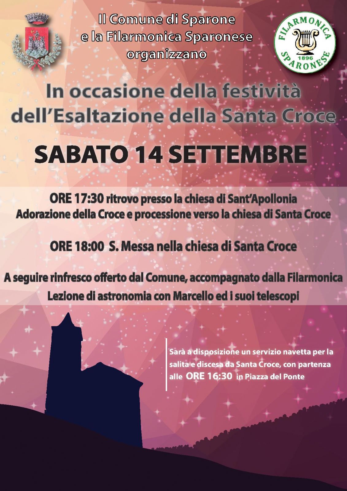 In occasione della festività dell'Esaltazione della Santa Croce - Sabato 14 settembre - Ritrovo ore 17.30 presso la Chiesa di Sant'Apollonia - S. Messa nella Chiesa di Santa Croce...A seguire rinfresco offerto dal Comune accompagnato dalla Filarmonica - Lezione di astronomia con Marcello ed i suoi telescopi.