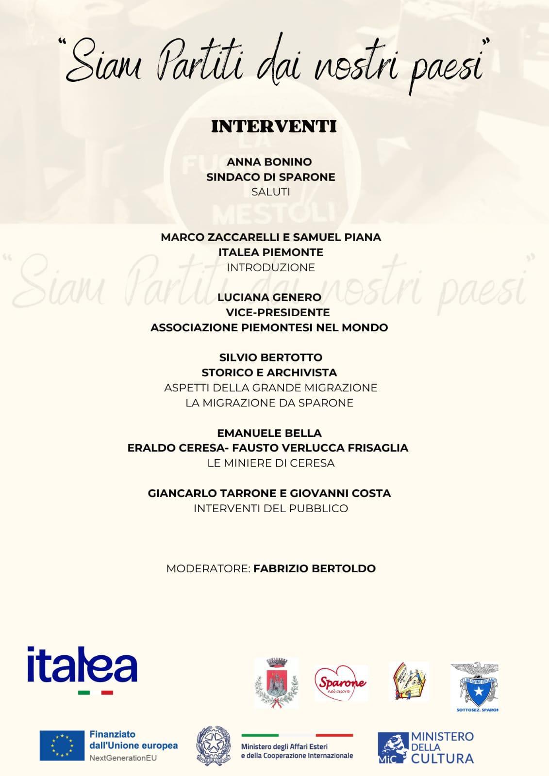 - 17.30 Tavola Rotonda "Emigrare dal Canavese" presso il Salone Polifunzionale di Sparone