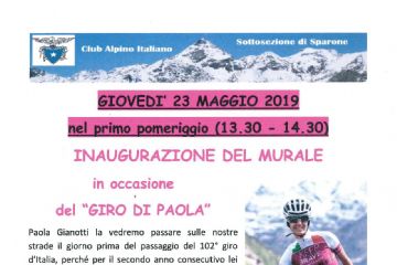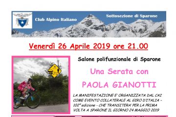 Venerdì 26 aprile 2019 ore 21.00 - Una serata con PAOLA GIANOTTI - Salone Polifunzionale di Sparone - La Manifestazione è organizzata dal CAI come evento collaterale al Giro d'Italia - 102°Edizione...